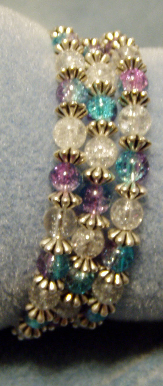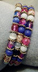 Glass pinks, blues, and purples colored stones and silver spacers on memory wire.