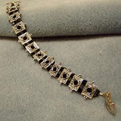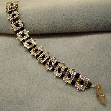 bracelet. Black stones separate each piece. A square toggle clasp pulls the design