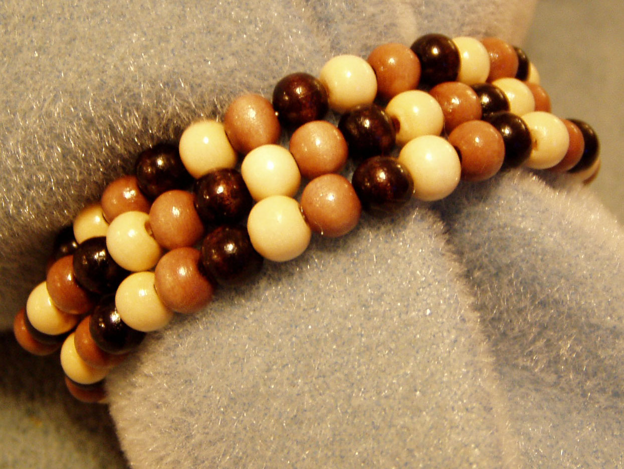 Multi-colored wooden beads on memory wire.