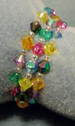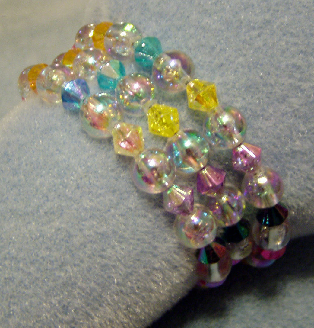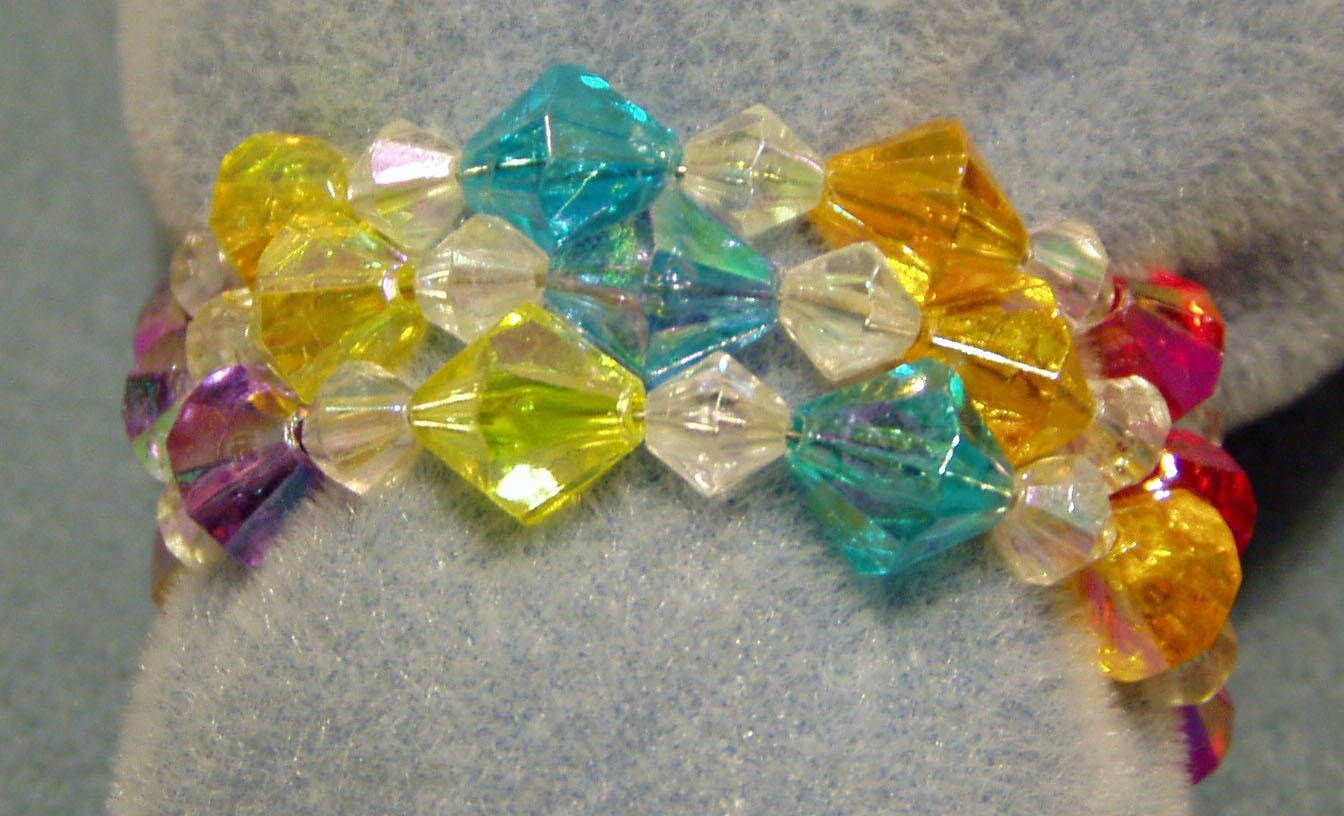 Multi-colored crystal plastic beads on memory wire.