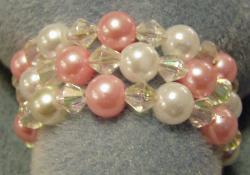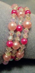 Pearls, pink, and crystal plastic beads on memory wire.